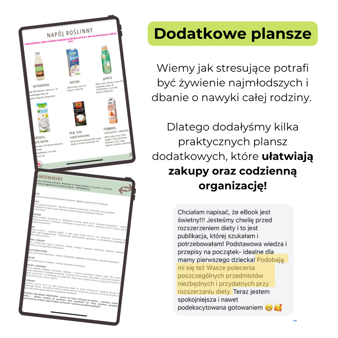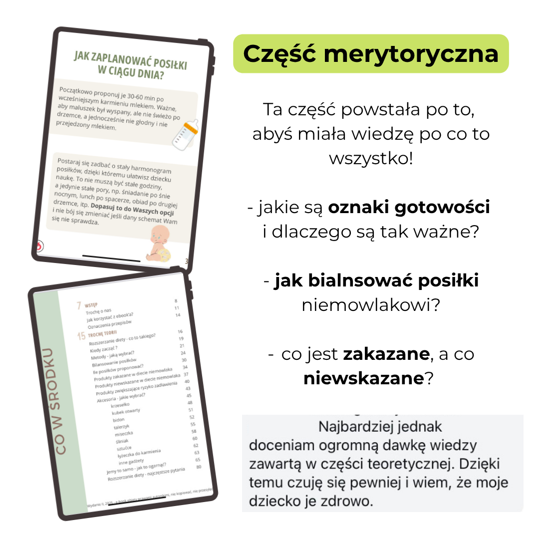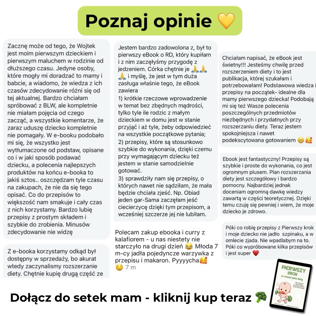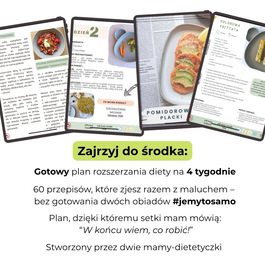 ✅ Kompletny przewodnik po rozszerzaniu diety – jasno i konkretnie wyjaśniamy, co, kiedy i jak podawać, byś nie musiała szukać informacji w wielu miejscach.
