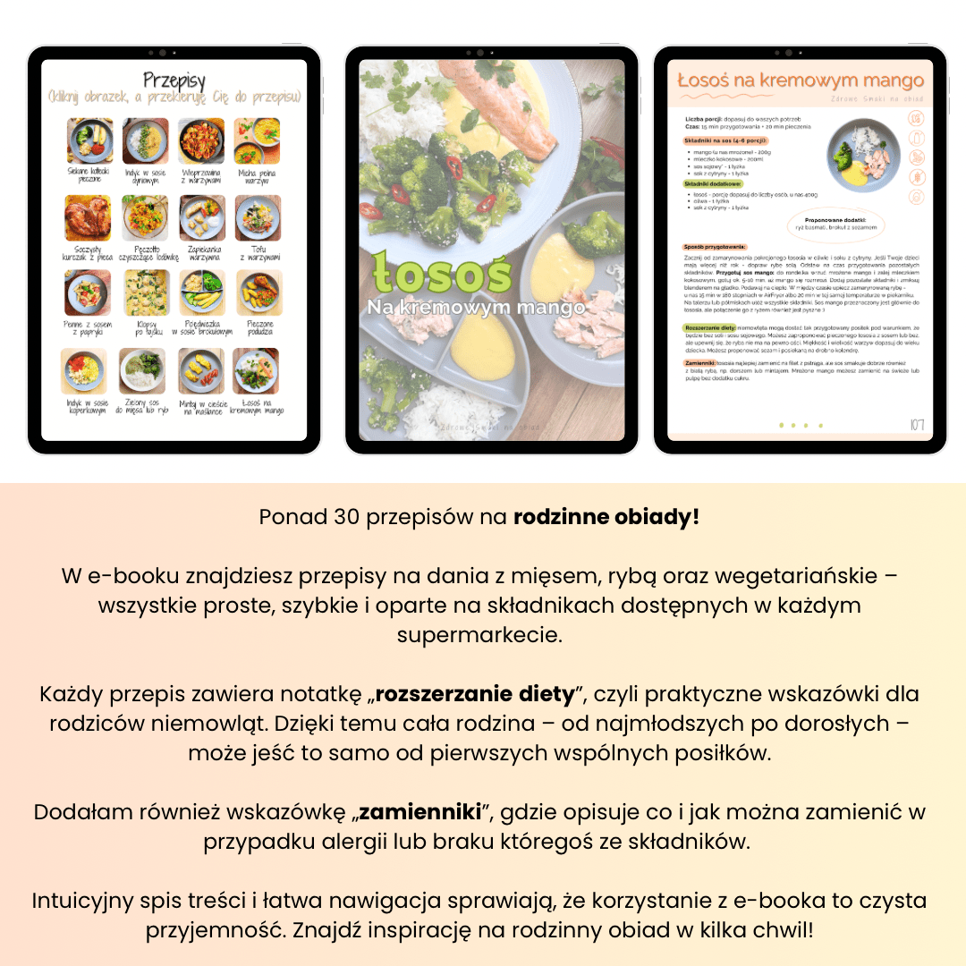 ✅ Ponad 30 przepisów na pyszne, pełnowartościowe obiady – proste, szybkie i dostosowane do całej rodziny, także dla maluchów w trakcie rozszerzania diety. Łosoś na kremowym mango, szybkie orzo, a może falafelki z kaszą jaglaną? Na pewno znajdziesz coś dla siebie!