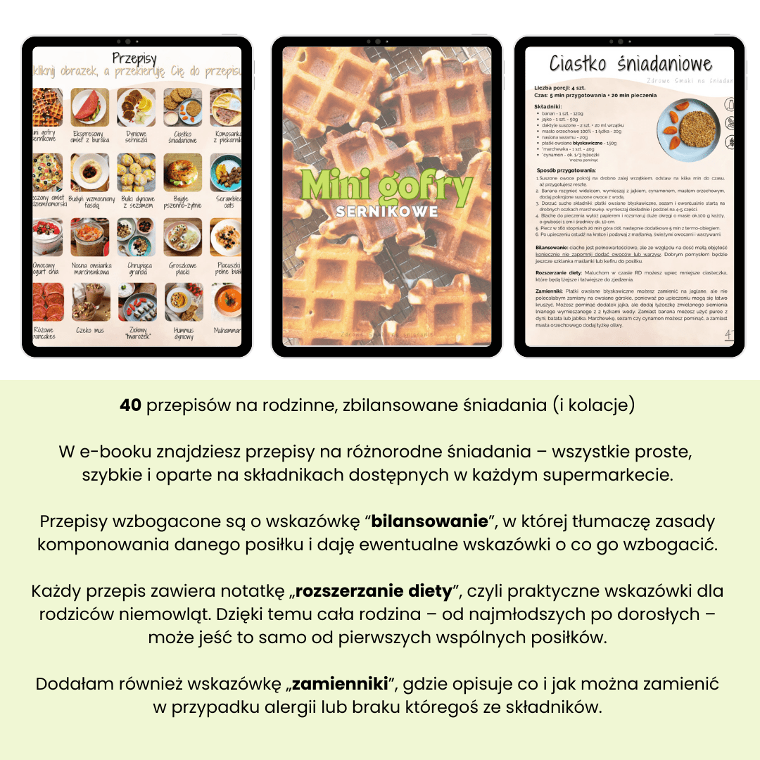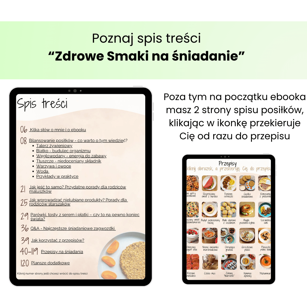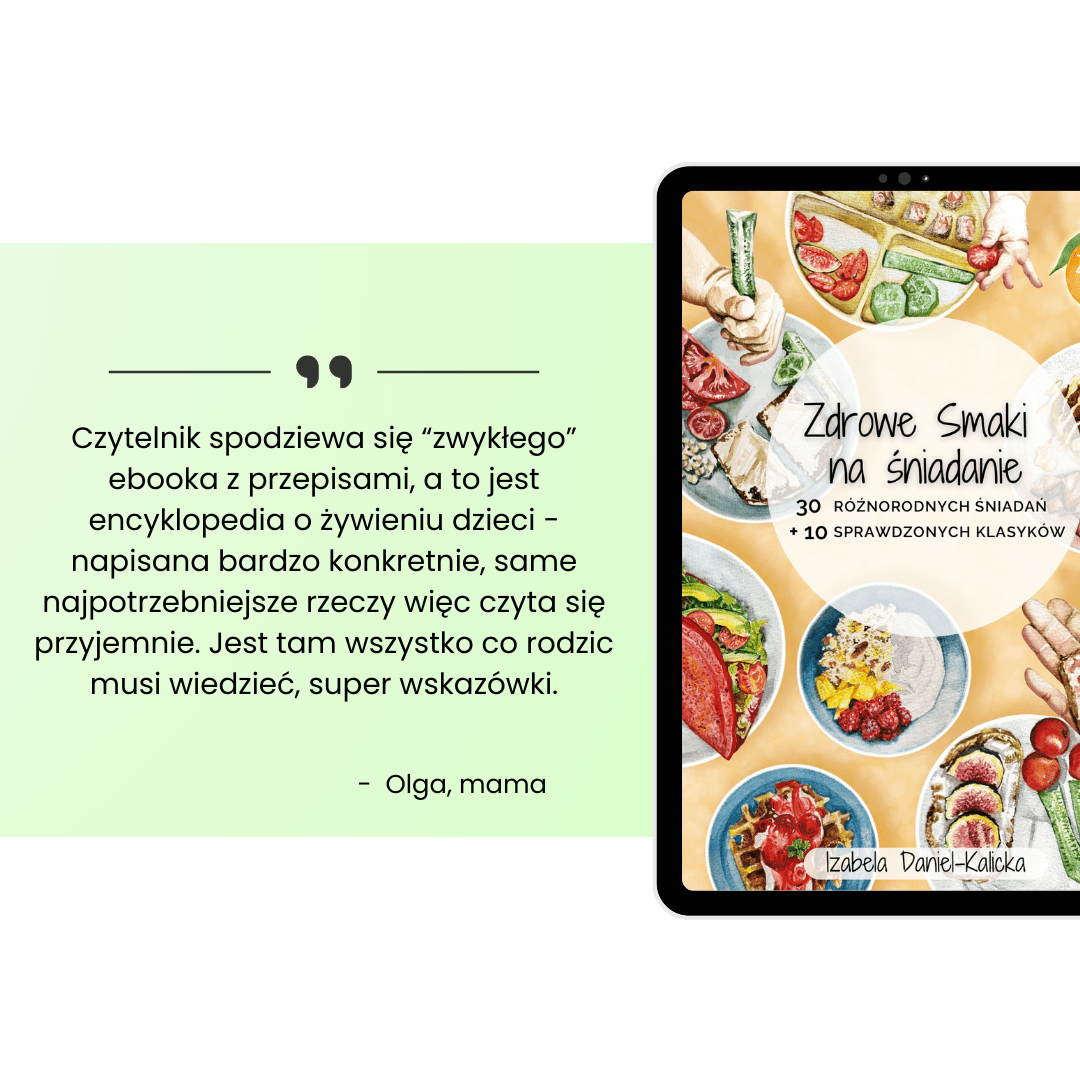 Masz dość porannej rutyny i braku pomysłów na zdrowe śniadania dla całej rodziny? “Zdrowe Smaki na śniadanie” to idealny ebook dla rodziców małych i dużych dzieci oraz wszystkich, którzy chcą odżywiać się zdrowo i różnorodnie – bez poświęcania na to wielu godzin. Zobacz co myśli o ebooku Ela, mama 3 latka – „Wszystko dobrze opisane, dla mnie na duży plus to, że od razu mamy podane zamienniki. Dodatkowo cała sekcja teoretyczna, i to, że wszystko jest od już zbilansowane i nie muszę się zastanawiać nad tym, czy posiłek jest wystarczająco dobry. No kocham!”