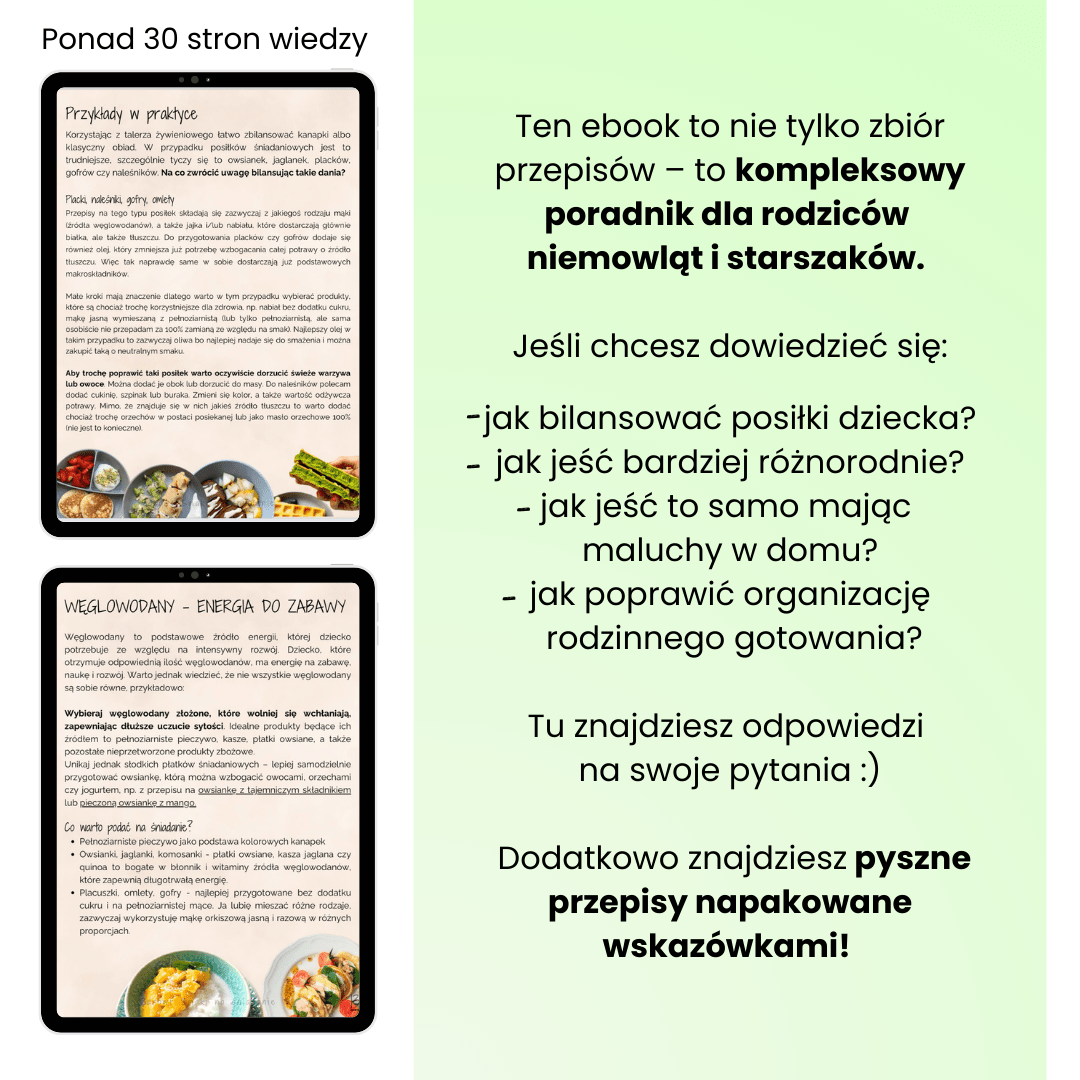 W ebooku znajdziesz mnóstwo przydatnych wskazówek: jak bilansować posiłki, co zrobić z posiłkiem w przypadku „niejadków”, oraz jak wprowadzać zdrowe zasady żywieniowe podczas rozszerzania diety dziecka.